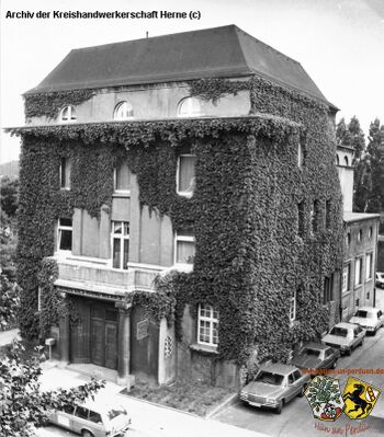 Die heutige Kreishandwerkerschaft Herne, auch "Haus des Handwerks" genannt, wurde im Jahr 1925 als Gesellschaftshauses der Freimaurerloge "Eiche auf roter Erde" vom Architekten Dipl.-Ing Ludwig Feldmann[1] errichtet. Am 2. Februar 1925 wurde der Baubeschluss gefasst und schon am 9. März 1925 der Grundstein gelegt. Nach nur 9 Monaten Bauzeit, konnte am 12. Dezember 1925 die feierliche Einweihung erfolgen.