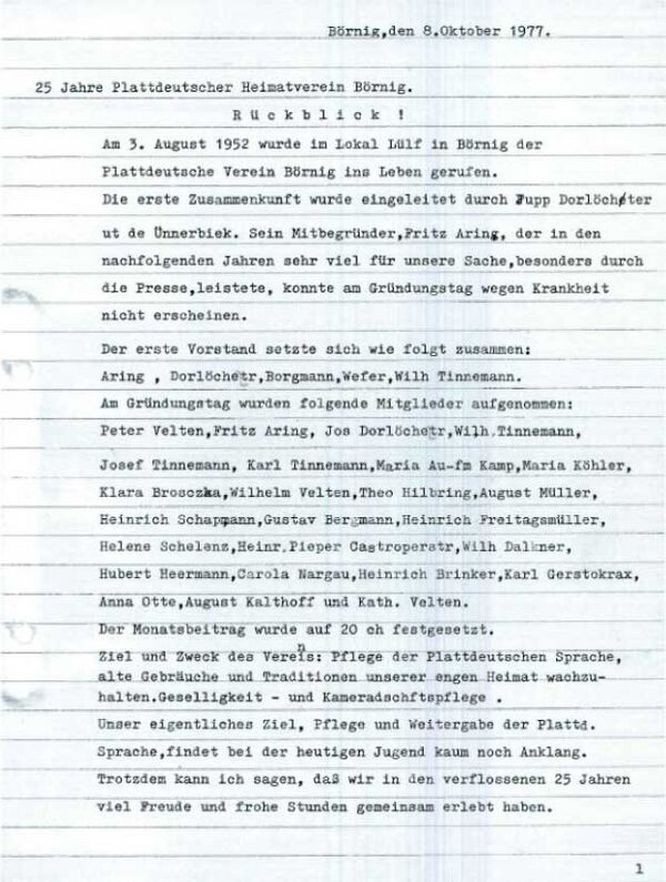 Es ist ein schönes Beispiel für das damals vielfaltige Vereinsleben im Dorf Börnig. Es gibt zwar auch heute noch einige wenige BörnigerInnen, die diesen Dialekt beherrschen, aber in weiteren 20 oder 30 Jahren ist das Plattdeutsche dann sicherlich nur noch Historie.
