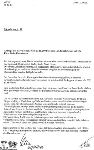 Die Stadt Herne schrieb einen Brief von 4 Seiten, in dem sie ihren Standpunkt niederlegte. Die Antworten hatte ich in etwa erwartet, wenn auch nicht in dieser Länge. Schließlich ist man in Herne immer bereit den Gefahrenbaum Pappel zu vernichten, wo es eben geht. Das Schreiben ist wohl eine Mischung der Meinung verschiedener Ämter. Inhaltlich ist dazu nichts zu sagen. Sie haben die Sache so durchgeführt. Es ist ihre Meinung. Zum ökologischen Anspruch den sie mehrfach betonen und der auch noch fachlich richtig sein soll, kann ich nur sagen das ist Quatsch. Ein Waldbetretungsrecht besagt nun mal nicht, dass der Wald auch auf- und ausgeräumt sein muss, oder das alle Bäume gerade stehen müssen.
