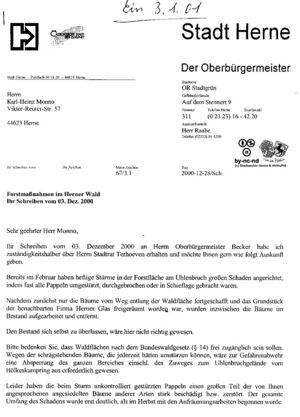 - Hiermit möchte ich an mein Schreiben vom 3. Dezember 2000 erinnern. Mit der Eingangsbestätigung sagten Sie mir eine Überprüfung der Angelegenheit und eine Auskunft über das Ergebnis zu. Inzwischen sind die Holzungen weiter durchgeführt worden. Verbunden ist das auch mit Belästigungen von Bürgern durch das auf den Wanderwegen gelagerte Holz. Beschwerden darüber sind zumindest von einem Bürger an die Stadt gerichtet worden und erfolglos geblieben.