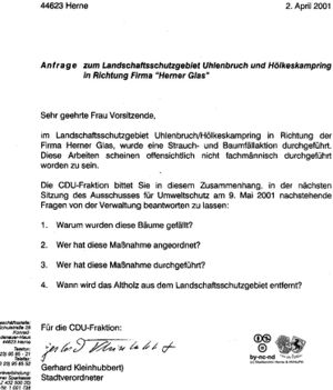 - Außer vielen kleinen Holzungen haben mir vor allen zwei größere, eine auf dem Flottmann-Gelände und eine im LSG Auf Uhlenbruch nicht gefallen. Meiner Meinung nach ist dabei auch gegen bestehende Vorschriften z. B. den Forstbetriebplan der Stadt verstoßen worden. Danach dürfte ein Kahlschlag nur in einer Größe von 500 m2 erfolgen. Bei Maßnahmen in Landschaftsschutzgebieten müssten auch untere Landschaftsbehörde und der Beirat gehört werden. Ich halte es auch nicht für demokratisch, die Bevölkerung nicht rechtzeitig zu informieren. Es sollten alle zuständigen Gremien in der Stadt gehört und beteiligt werden. Auch versammlungsrechtlich scheint mir einiges nicht in Ordnung zu sein. So wurden bisher Anfragen, die rechtzeitig und schriftlich gestellt wurden der Einladung beigefügt, so dass sich jeder Teilnehmer rechtzeitig vorbereiten konnte und von seinem Recht Zusatzfragen zu stellen, Gebrauch machen konnte. Ich bitte, mir vor allem über Frage Auskunft zu geben, ob der Landschaftsbeirat bei Maßnahmen nach Sturmschäden zu hören ist. In diesem Fall wäre es möglich gewesen da zwischen Sturm und Holzung ein längerer Zeitraum lag.