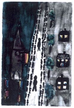 Nun bewegt sich der Zug durch die Widumerstraße. — Es ist eine ruhige und stille Straße. - An normalen Tagen spielen wir auf dem Asphalt mit den anderen Kindern. Man kann dann Ballspiele machen, Reifen jagen. Humpeln und im Winter gibt es endlose Schlinderbahnen. Heute ist es aber feierlich ruhig! Links ist am Anfang ein Teil der Kirche, ein wenig weiter der Friedhof, rechts sind dann zwei Pfarrhäuser und dann kommt das Krankenhaus.