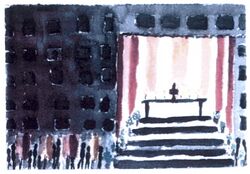 Hier ist die erste Station. Draußen, unter der Kapelle, die im ersten Stock ist, hat man den Altar aufgebaut Mit Stufen, die zum Altar führen. Alles mit Teppichen ausgelegt, die Rückwand mit Tüchern und Fahnen abgespannt, auf dem Altartisch viele Blumen und brennende Kerzen. Und kurz, bevor man ankommt, sieht man schemenhaft da und dort noch eine Nonne hin- und her huschen, die noch einmal nach dem Rechten sieht. Der Pastor trägt die Monstranz würdigen Schrittes die Stufen empor, zum Altartisch.