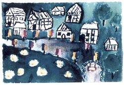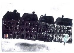 Und dann kommen vier bis fünf große Bergmannshäuser. Sie sind riesig, mit vielen gleichmäßigen Fenstern. Ganz sparsam hängt da und dort ein Fähnchen heraus, in weiß-blau, oder rot-weiß oder manchmal sogar mit einem gestickten Namen darauf. Der Bürgersteig ist ungepflastert, aber ganz frisch gelegt. Ab und zu lehnt an der Häuserwand ein Birkenbäumchen. Auf der anderen Straßenseite sind Gärten.