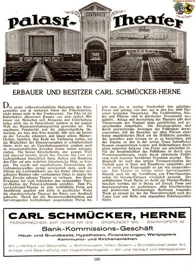 "Auch das alte Hintzpetersche Besitztum (Stiegeler) ist in Düssings Besitz übergegangen. Das Grundstück hatte im Jahre 1874 der Uhrmacher Karl Hintzpeter von Rensinghoff gt. Schlenkhoff gekauft u. mit dem heute noch stehenden 2stöckigen Hause bebaut. Im Jahre 1884 heiratete die Witwe Hintzpeter in zweiter Ehe den Uhrmacher Karl Guschke, aber im gleichen Jahre kam das Besitztum an den Nachbarn, den Kupferschmied Hermann Düssing. Im Hofraum wurde ein Fabrikgebäude des Klempners Christian Schmücker errichtet, das 1913 abgebrochen und durch ein Lichtspielhaus (Palast-Theater, heute Gloria-Palast) mit Einfügung in die Straßenfront ersetzt wurde. Es war 1920 im Besitz des Kaufmanns Karl Schmücker, seit 1930 aber ist die Ehefrau Fritz Siekmeyer, Julia geb. Düssing, wieder als Eigentümerin eingetragen."[1]