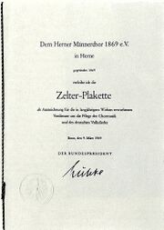 | 09:13, 3. Mär. 2019 | Urkunde Zelter-Plakette.jpg (Datei) | 170 KB | Thorsten Schmidt (Diskussion | Beiträge) | User created page with UploadWizard | 1 | |