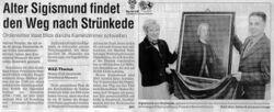 - "1742 den 11. Januarii ist der [Johann Conrad] Freiherr von Strünkede Excellenz zu Cleve nachmittags um 3 Uhr verstorben und den 30. Januar von Cleve hierher gebracht, den 31. aber des Abends um 6 Uhr von Strünkede hierhin in die Begräbniß-Capelle geführet, [...] in der ersten Kutsche saßen der Herr Baron Ludwig von Strünkede, unser hiesiger nachfolgender Gerichtsherr, der Herr von Crudenburg, der Herr von Gartrop[9] und der Herr von Reck zu Kreidemühl[10] ; [...] Er wurde geläutet, so lange biß die Leiche von Strünkede hierher gelangt und hernach, da sie wieder wegfuhren."[11]