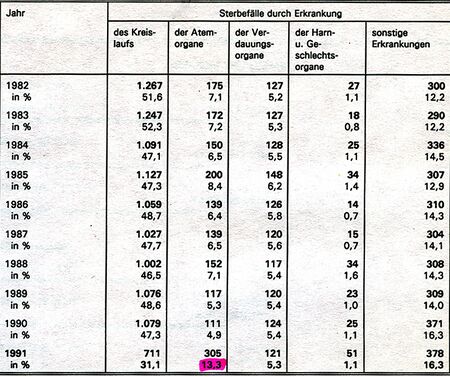 Es kann schon mal ganz normale Schreibfehler sein. Um mir Klarheit zu verschaffen machte ich eine entsprechende Anfrage. Als Antwort bekam ich die Auskunft, bei dieser Rubrik in den städtischen Zahlen handele es sich um eine grobe Zuordnung der Todesfälle. Das Landesamt für Statistik mache da genauere Angaben. Das führe am Jahresende zu einer Bereinigung der Zahlen. Die Stadt gab zu ihren Statistiken auch Vierteljahreshefte heraus. Da kann ich verstehen, dass dazwischen zu einer Berichtigung kommen kann. Aber andere Zahlen in den Jahresheften? Im Vorwärts wurde 1984 eine Medizinerstudie mit dem Titel Wälder sterben – Menschen husten veröffentlicht. Darin wurden Zusammenhänge zwischen Waldsterben und Atemwegserkrankungen festgestellt. Ignoranten kommen einem gerne mit dem Argument, alles Panikmache, die Menschen werden immer älter, leben länger. Das stimmt sogar, nur immer mehr Menschen haben für Anfälle Herz- oder Bronchialsprays in der Tasche. Ist ein Leben mit Sprays gesund, zeugt es von Lebensqualität? Gut ist es nur in den Kassen der Chemieindustrie, schlecht ist es bei den Krankenkassen. Deren Kosten explodieren. Der Hustende muss zahlen.
