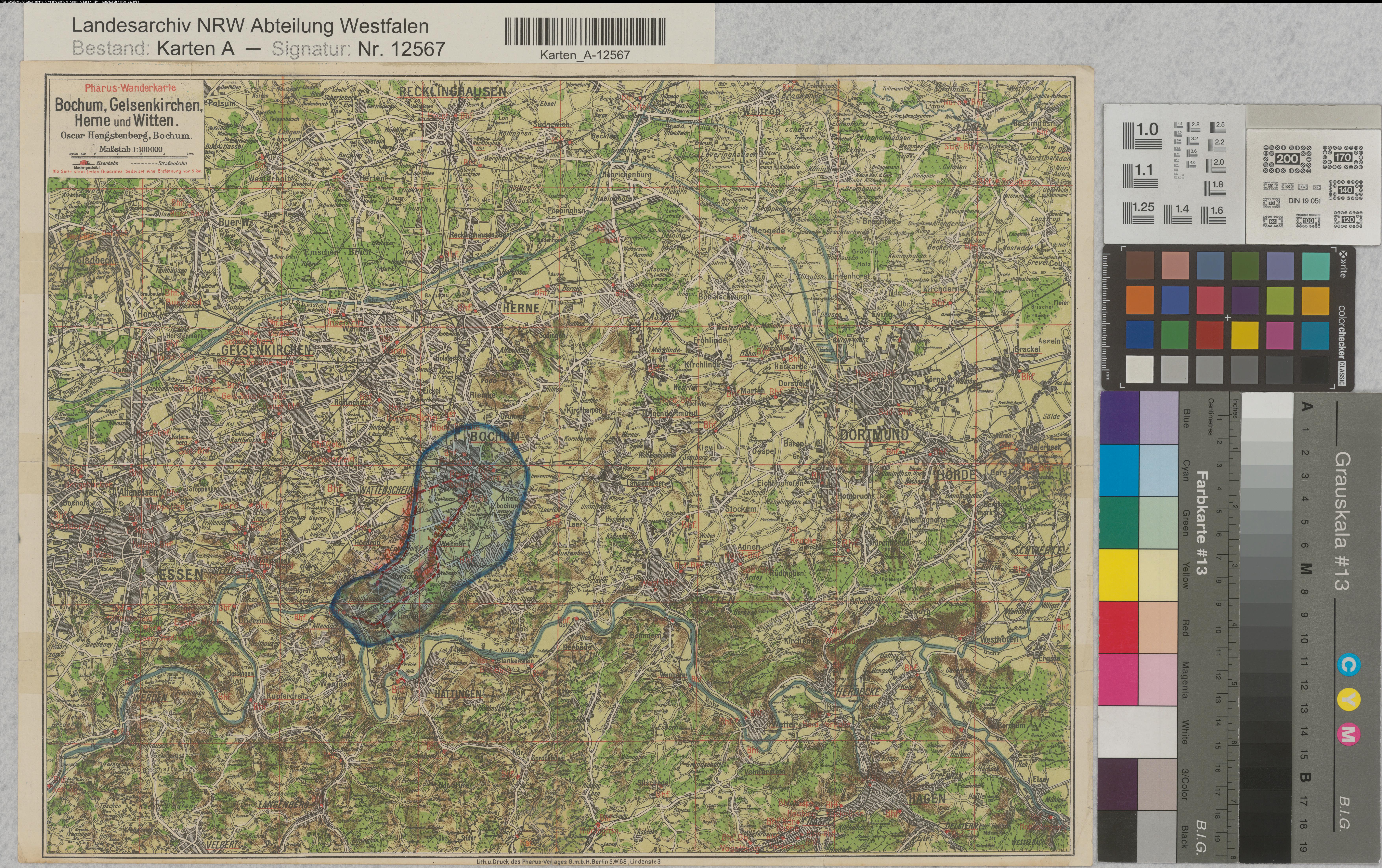 Die Wanderkarte des Pharus-Verlages aus Berlin aus dem Jahr 1919 zeigt im oberen rechten Bereich die Bebauungssituation der Stadt Herne und der Ämter Wanne und Eickel.