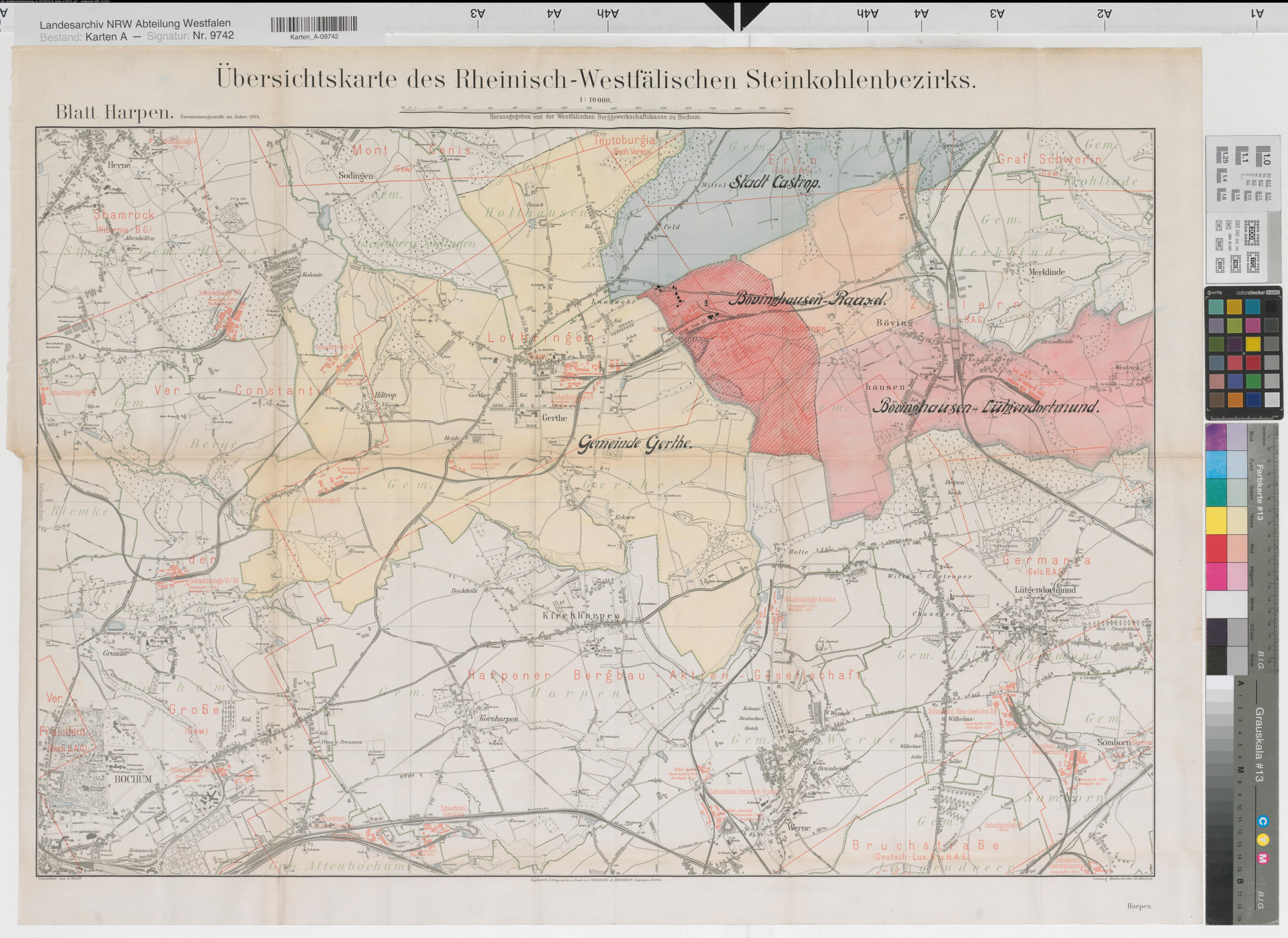 - farb. Einzeichnung von Bövinghausen-Rauxel (Castrop-Rauxel) Eingemeindungen - Einzeichnung in Blatt Harpen in Druck Regierung Arnsberg Nr. 17743