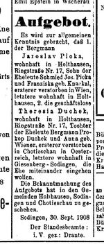 Aufgebotanzeige (Pilsen 1908)