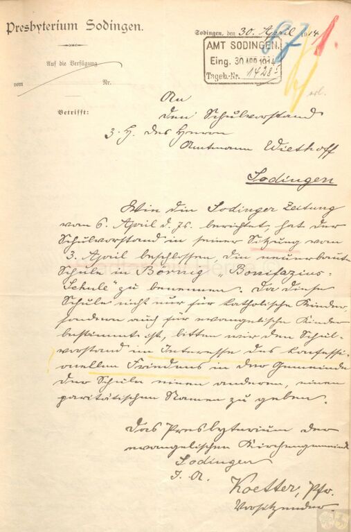 Datei:Schreiben des Presbyteriums Sodingen vom 30. April 1914.jpg