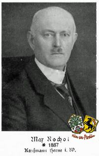 • Max Rocholl * 15. Dezember 1867. Volksschule, höhere Bürgerschule in Bochum und das Institut Knickenberg bei Telgte bis Obersekunda, Dienst beim Garde-Füs.-Rgt. in Berlin, kaufm. Lehre in Wülfrath, Vertreter, 1896 Gründung der Großhandlung für Eisen- und Kurzwaren in Herne. ∞ 18. september 1906 Coesfeld Maria Schmitz, * 285. März 1877 (E: Heinrich Schmitz u. Maria Hüger)