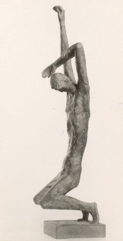 Der Künstler Herbert Volwahsen (geboren 11. Oktober 1906 in Skorischau/Schlesien; gestorben 23. März 1988 in Murnau am Staffelsee)[1] aus Dortmund hat das am 19. November 1967 von Oberbürgermeister Robert Brauner enthüllte Mahnmal geschaffen. Die Figur versinnbildlicht Fall und Aufstieg eines Menschen: Von der Gewalt zu Boden geworfen, richtet er sich wieder auf. Der erhobene Arm drückt Hoffnung aus.