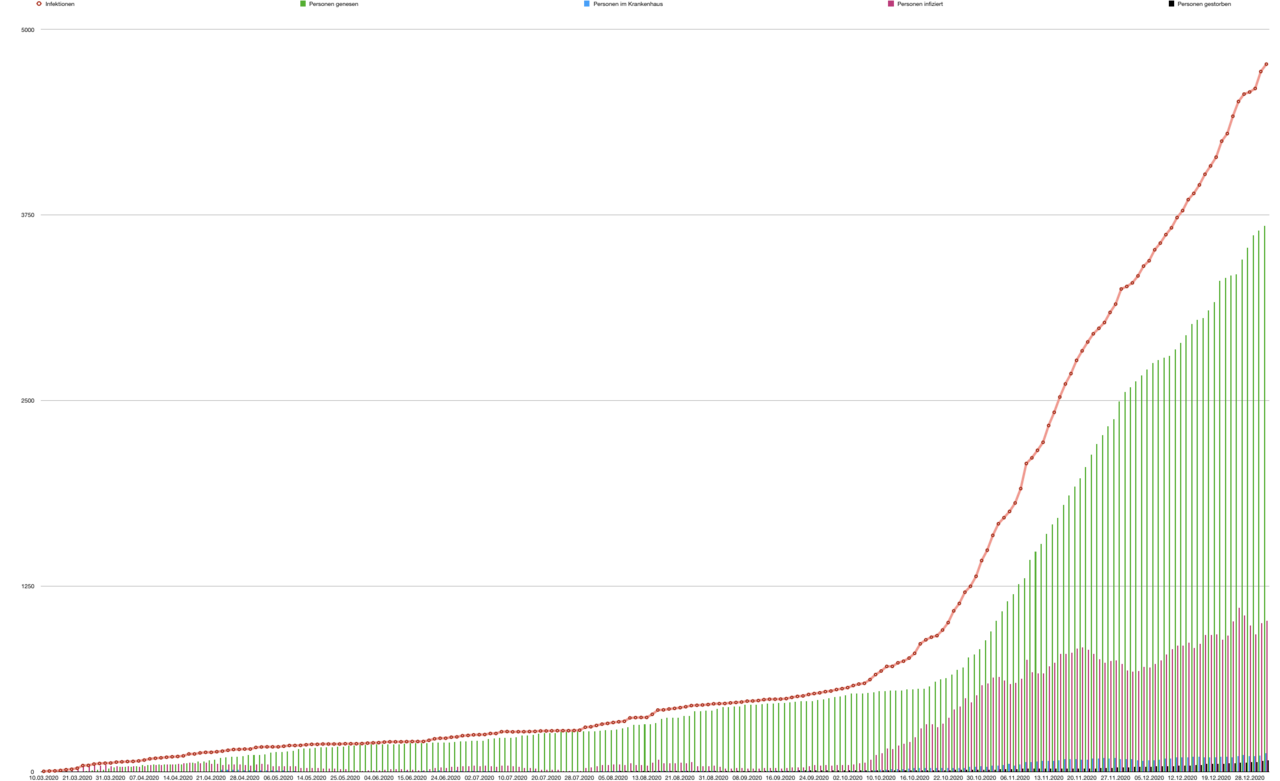 Verlauf der Infektion in Herne vom 10.03.2020 bis 31.12.2020. Alle Zahlen wurden von der Stadt Herne veröffentlicht.