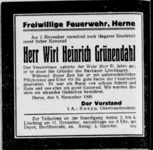 "Heinrich" Johann Wilhelm GRÜNENDAHL, Ev. * 08.04.1869 in Herne, ~ 05.05.1869 in Herne, St. Dionysius Herne (Dorfkirche), + 07.11.1929 in Herne. Berufe 1892 Raseur in Herne. von 1896 bis 1929 Restaurateur in Herne. Wohnung bis 1929 Bahnhofstraße 156 in Herne. Eltern: Carl "Heinrich" Friedrich GRÜNENDAHL, Ev. * 20.06.1844 in Herne, ~ 20.07.1844 in Herne, St. Dionysius Herne (Dorfkirche), + 22.12.1877 an Trunksucht in Herne. ± 25.12.1877 in Herne, Ev. Friedhof Herne (4.2.1841-11.2.1883). Berufe von 07.1868 bis 1877 Bäcker in Herne und bis 1877 Bergmann in Herne. oo 26.07.1868 in Herne mit "Anna" Maria Lisette GRÜNHOFF, Ev. * 16.01.1849 in Bochum-Günnigfeld, + 28.01.1917 an Lungenentzündung in Herne. ± 31.01.1917 in Herne. Wohnung bis 1917 Shamrockstraße 8a in Herne. oo 28.11.1892 in Herne, Kirchliche Heirat am 29.11.1892 in Herne mit "Dorothea" Friederike Lisette FUNKENBERG, Ev. * 24.03.1870 in Herne, ~ 08.04.1870 in Herne, St. Dionysius Herne (Dorfkirche), + 17.07.1934 in Herne, evangelisches Krankenhaus. Eltern: Heinrich "Ludwig" FUNKENBERG, Ref. * 28.11.1816 in Herne-Strünkede (Ölmühle), + 06.03.1896 an Altersschwäche in Herne-Baukau, ± 10.03.1896 in Herne, 3. Ev. Friedhof Bergelmanns Hof (11.02.1883-1905). Berufe von 1858 bis 1896 Zimmermann und 1862 Schreiner in Herne. Wohnung bis 1896 Strünkeder Straße 4 in Herne-Baukau. oo 17.11.1858 in Herne mit Caroline BUSCHKAMP (Busskamp) * 31.01.1840 in Bochum NW Deutschland.