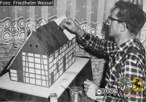 Später, nach seiner Pensionierung, arbeitete der gelernte Sodinger Hufschmied auch für das Emschertal-Museum. Günter Schneider erinnert sich: »Zeitweise hatte mein Vater sogar eine Werkstatt im Schollbrockhaus, dort baute er unter anderem für das Museum das Dorf Haranni nach.« Auch das Emschertal-Museum gehörte einst zu den Erben des ehemaligen MC-Kumpels, denn er überließ der Einrichtung im Schloss Strünkede in den 1980er-Jahren seine einst liebevoll gehütete und gepflegte Feldschmiede. [2]