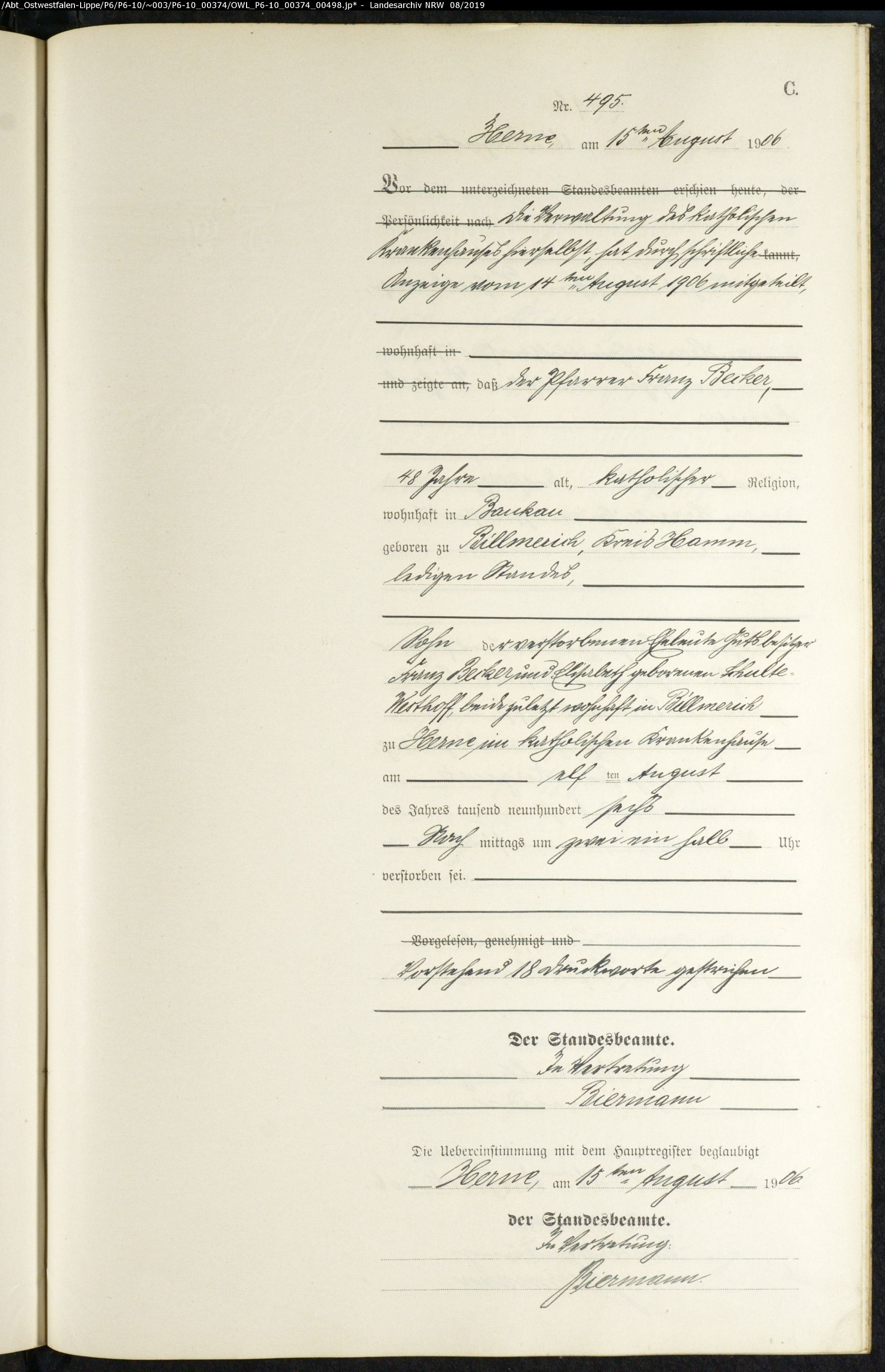 Er starb im Marienhospital in Herne am 11. August 1906[2] und wurde am 15. August 1906[3] auf dem Baukauer Friedhof beigesetzt. Sein Grabdenkmal steht noch heute über alle Priestergräber der St. Marien Gemeinde.