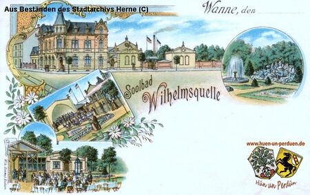 Am 3. Juli 1893 schlugen Bergleute der Zeche Pluto-Thies in 606 Meter Tiefe eine Solequelle an, und am 19. September 1893 wurde der Bergbau-Aktien-Gesellschaft "Pluto" das Eigentum des Bergwerkes "Wilhelmsquelle" zur Gewinnung der in diesem Felde vorkommenden "Soole" verliehen.[1] Die Sole erwies sich als eine der stärksten Deutschlands. Sie zeigte Heilwirkung bei Rheuma, Ischias, Nerven- und Frauenleiden.