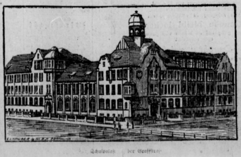 Es lag in der Natur der Sache, dass die junge Stadt mit der Verleihung der Städterechte auch enorme Pflichten übernehmen musste. Ganz besonderes Gewicht musste die Verwaltung auf den Ausbau des Schulwesens legen. Denn „Jung Deutschland“ stellte bald ein ansehnliches Regiment, das nach wenigen Jahren zu einem gewaltigen Heere anwuchs. Es mussten immer wieder neue Schulhäuser errichtet, neue Lehrkräfte angestellt werden, sodass der Stadtsäckel sehr in Anspruch genommen wurde. In 17 siebenklassigen Schulsystemen werden zurzeit 11 776 Volksschulkinder unterrichtet. Der von der Stadt zu deckende Fehlbetrag für die Volksschulen stellte sich im Vorjahre auf 662.700 Mk. Das ist schon etwas. Die neuen Volksschulgebäude stellen aber auch wahre Paläste dar, wie aus einem unserer beigefügten Bilder hervorgeht; der Schulbau ist für 28 Klassen eingerichtet und mit einer Turnhalle verbunden.