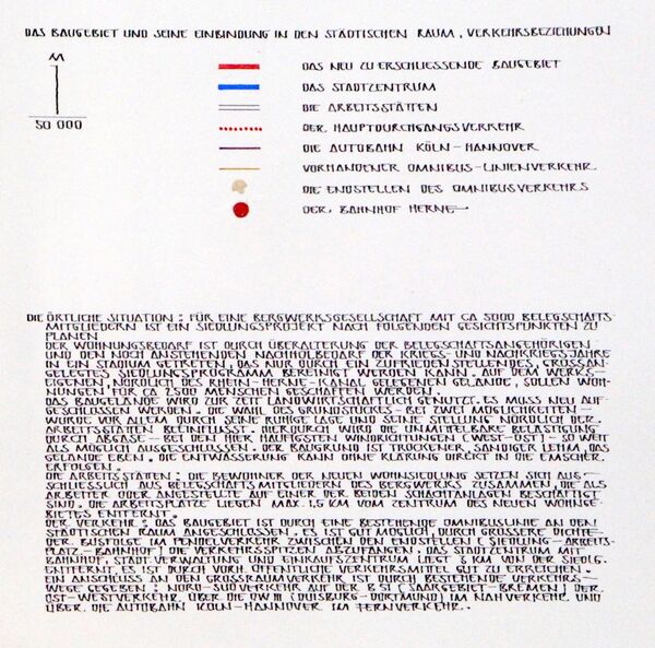 Der Wohnungsbedarf ist durch Überalterung der Belegschaftsangehörigen und den noch anstehenden Nachholbedarf der Kriegs- und Nachkriegsjahre in ein Stadium getreten, dass nur durch ein zufriedenstellendes großangelegtes Siedlungsprogramm bereinigt werden kann. Auf dem werkseigenen, nördlich des Rhein-Herne-Kanal gelgegenen Gelände, sollen Wohnungen für ca. 2.500 Menschen geschaffen werden.