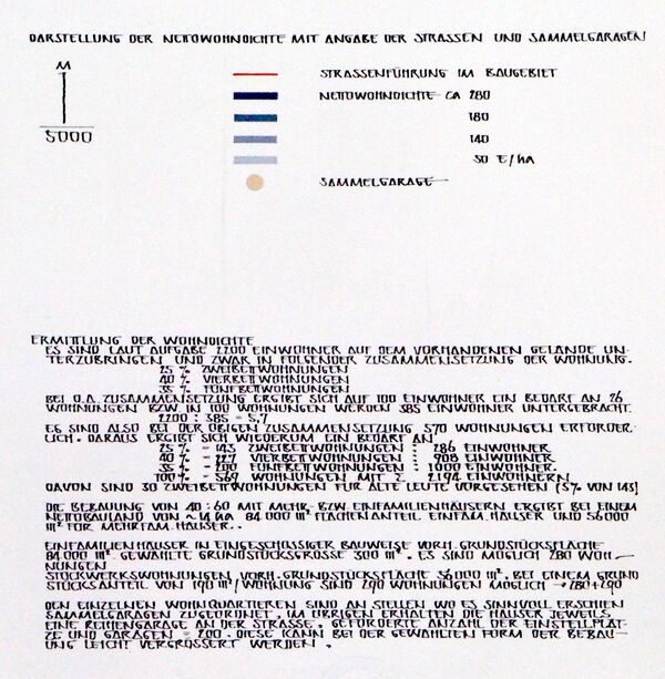 Die Nettofläche ergibt sich zu 220.000 - 72.500 = 147.500 m². Die durchschnittliche Nettowohndichte bei 2.200 Einwohnern beträgt ca. 160 Einwohner / ha.