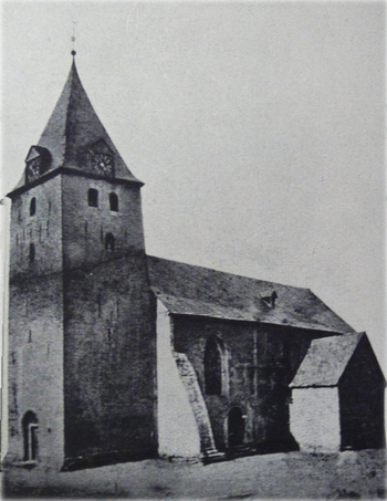 zu sagen. Er ist bereits im Mai 1873 abgebrochen worden, während die übrige Kirche weiter benutzt wurde. Die Hau- und Bruchsteine, aus denen der Turm bestand, sind zur Fundamentierung der neuen Kirche mitbenutzt worden. Der Turm musste schon vor der Aufgabe der alten Kirche abgerissen werden, weil er zusammenzustürzen drohte. Darüber berichtet Dransfeld: „Der Turm der alten Kirche war ungefähr 90-100 Fuß (= 28—31 Meter) hoch, viereckig, massiv gemauert und mit einer kleinen Spitze versehen. War das Schiff der Kirche wohl alt, aber doch fest, so war der Turm beinah baufällig zu nennen. Bereits 1823 hatten sich bedeutende Risse in ihm gezeigt, so dass die Behörden darauf drangen, die Glocken herauszunehmen, weil durch die Erschütterung beim Läuten die Gefahr des Einsturzes drohe. Vor der Hand wurde damals die Sache von der Gemeindevertretung noch zurückgehalten und beschlossen, den Turm durch Sachverständige zunächst untersuchen, inzwischen das Läuten aber nur mit der kleinsten Glocke bewerkstelligen zu lassen. Später, im Jahre 1825, wurde dann durch Einfügung verschiedener Balken das Mauerwerk genügend gestützt und die Glocken zweckmäßiger aufgehängt, so dass die Gefahr eines Einsturzes durch zunächst beseitigt wurde. Auf dem Balken, an welchem die größte Glocke aufgehängt war, befand sich aus jener Zeit die Inschrift: